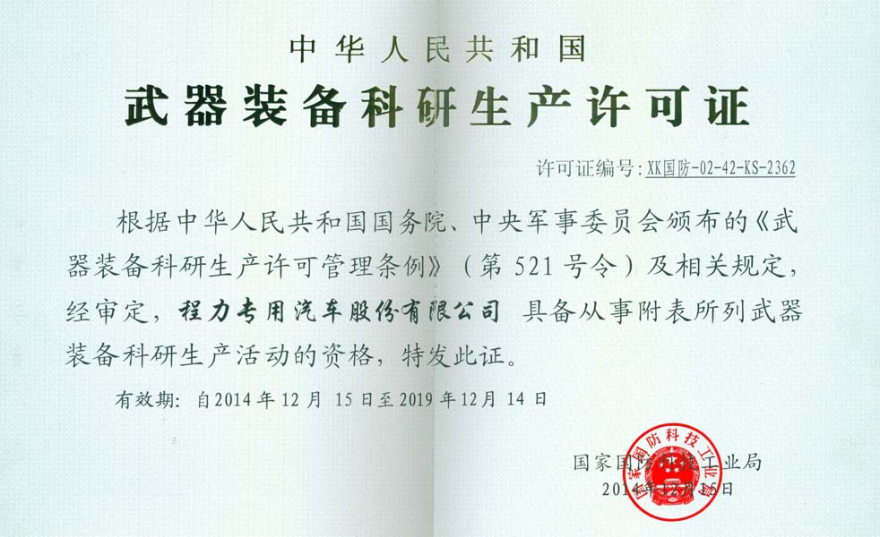 幾乎通過(guò)了專用車類所有國(guó)內(nèi)國(guó)際認(rèn)證,具有客車生產(chǎn)資質(zhì)、特種車生產(chǎn)許可資質(zhì)和國(guó)家武器裝備科研生產(chǎn)資質(zhì),840多個(gè)“程力威”牌產(chǎn)品列入國(guó)家公告目錄。