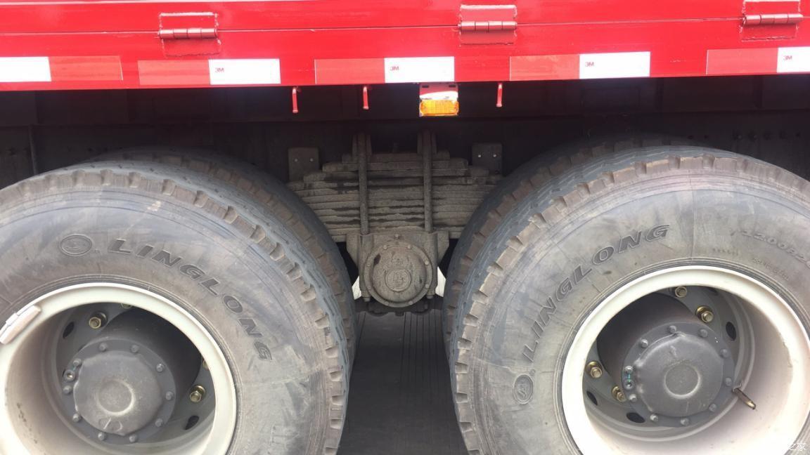 前面我們也說到了,車輛運輸的貨物偶爾會超載,所以說還是要保證車輛的運載能力。前橋采用了一對7.5噸級別的車橋,后橋則是一對MAN技術的16噸輪邊減速橋,全車使用了多片拋物線鋼板彈簧懸掛。輪邊減速橋使得車輛的離地間隙提高,通過性更好。且較大的主減速比,也能夠輸出更大的扭矩,適應復雜工況的運輸。該車配備的是12.00R20的鋼絲胎,也是重載運輸的配置。